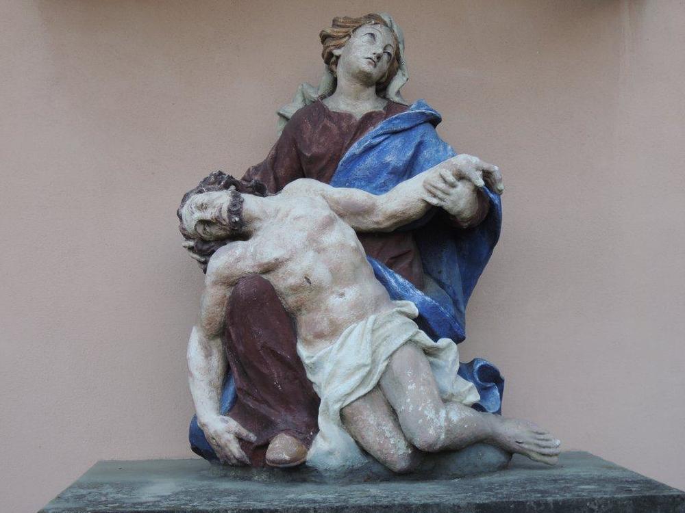 Die Pietastatue ist jährlich am ersten Bitttag Ausgangspunkt für die Bittprozession, die über den Franziskusbrunnen und die Mariensäule zur Pfarrkirche führt.